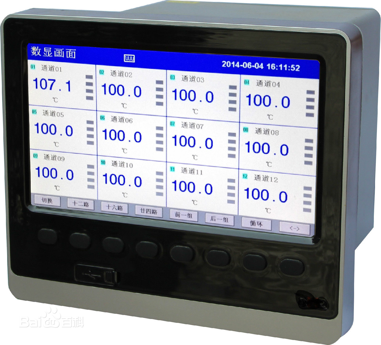 7英寸800*480点阵宽屏TFT高亮度彩色图形液晶显示,LED背光、画面清晰、宽视角。屏幕亮度可以自由调节显示内容可由汉字,数字,过程曲线,棒图等组成,通过面板按键可完成画面翻页,历史数据前后搜索,曲线时标变更等 |